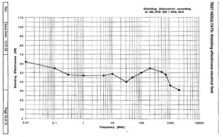 Certificat du Tissu HFShields - 50 dB Naturell Swiss Shield ® (exigences normes militaires de tests MIL-STD 285 ou IEEE 299-1997)